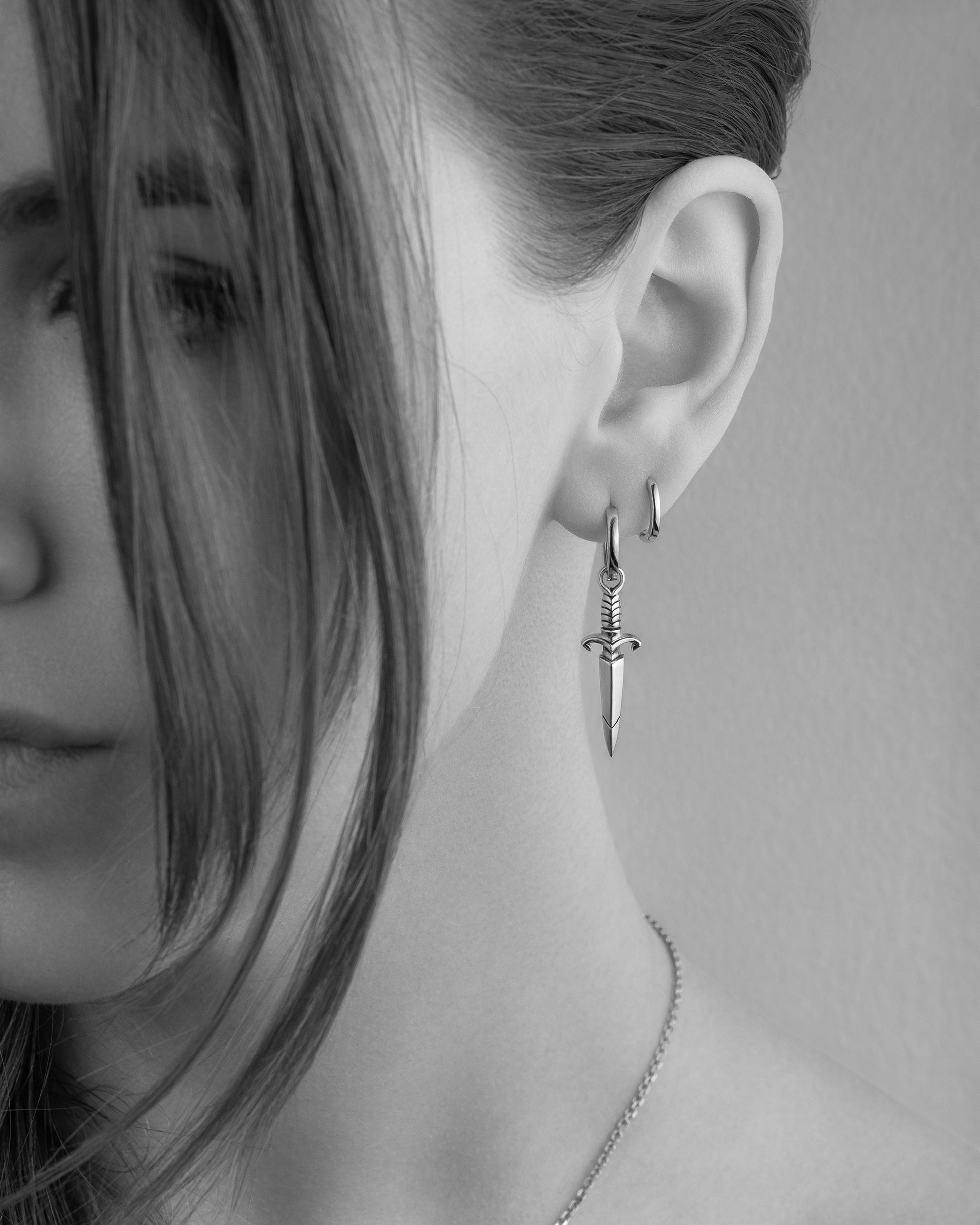 This edgy statement earrings are inspired by the sleek, seductive forms of daggers and swords. Delicate yet dangerous, its design embodies a perfect balance of strength and elegance.