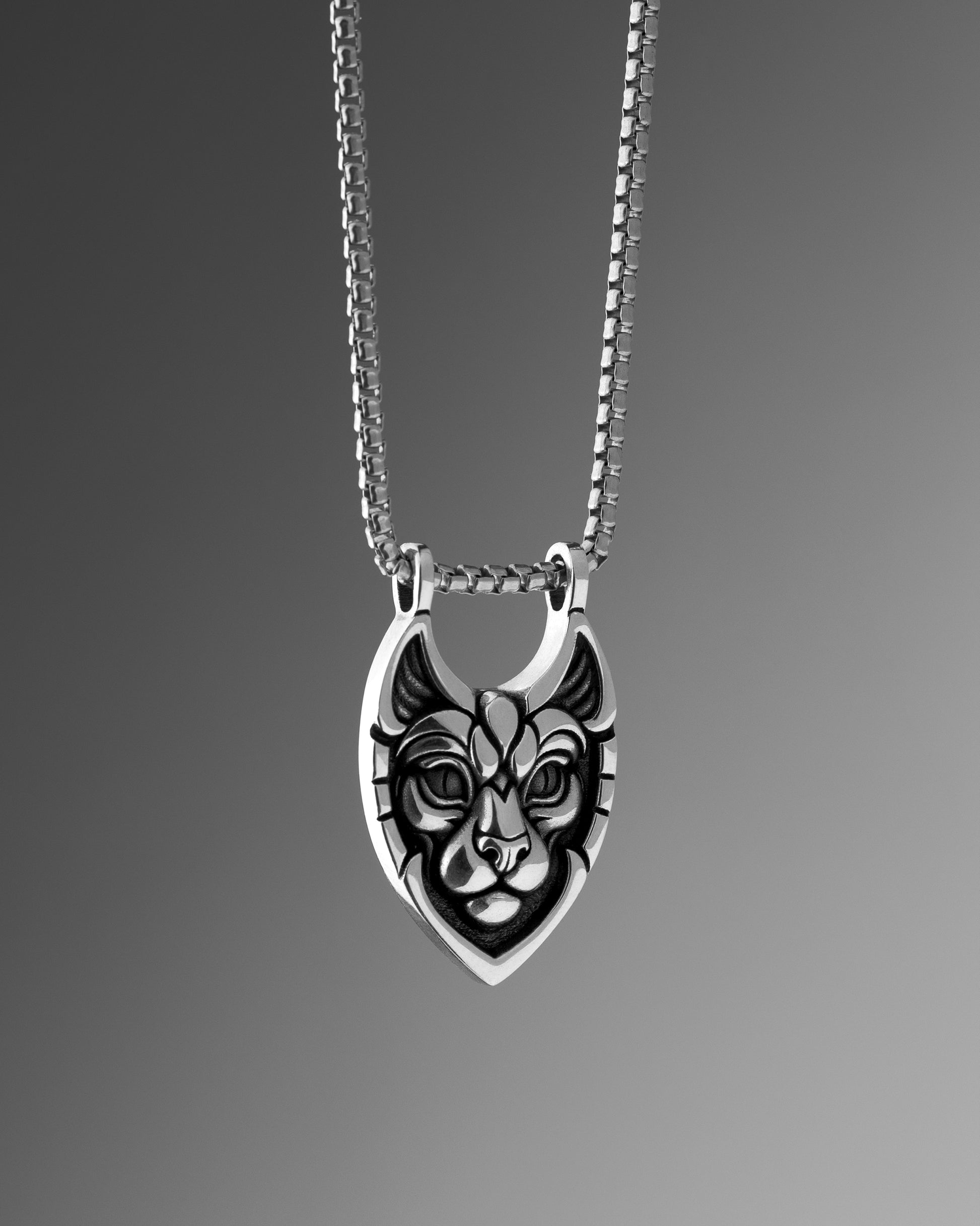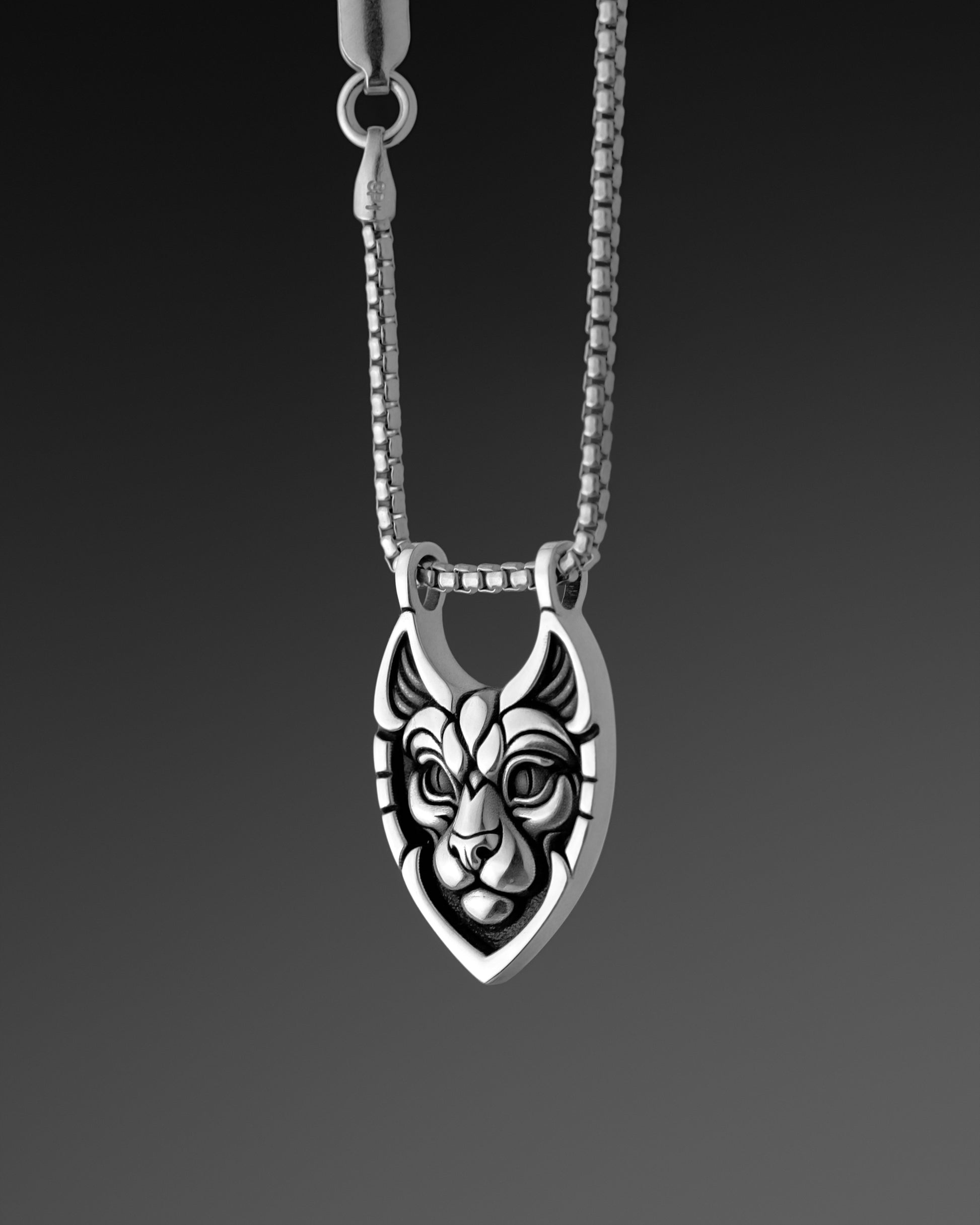 Inspired by the Egyptian goddess Bastet, this silver pendant features a stylized cat face sculpted into a shield-shaped frame, with complimentary Art Deco engraving on the back. A modern talisman of protection and independence, it blends ancient Egyptian symbolism with bold geometric design. Crafted in small batches, this unique piece is perfect for cat lovers, mythology enthusiasts, and collectors of statement jewelry.