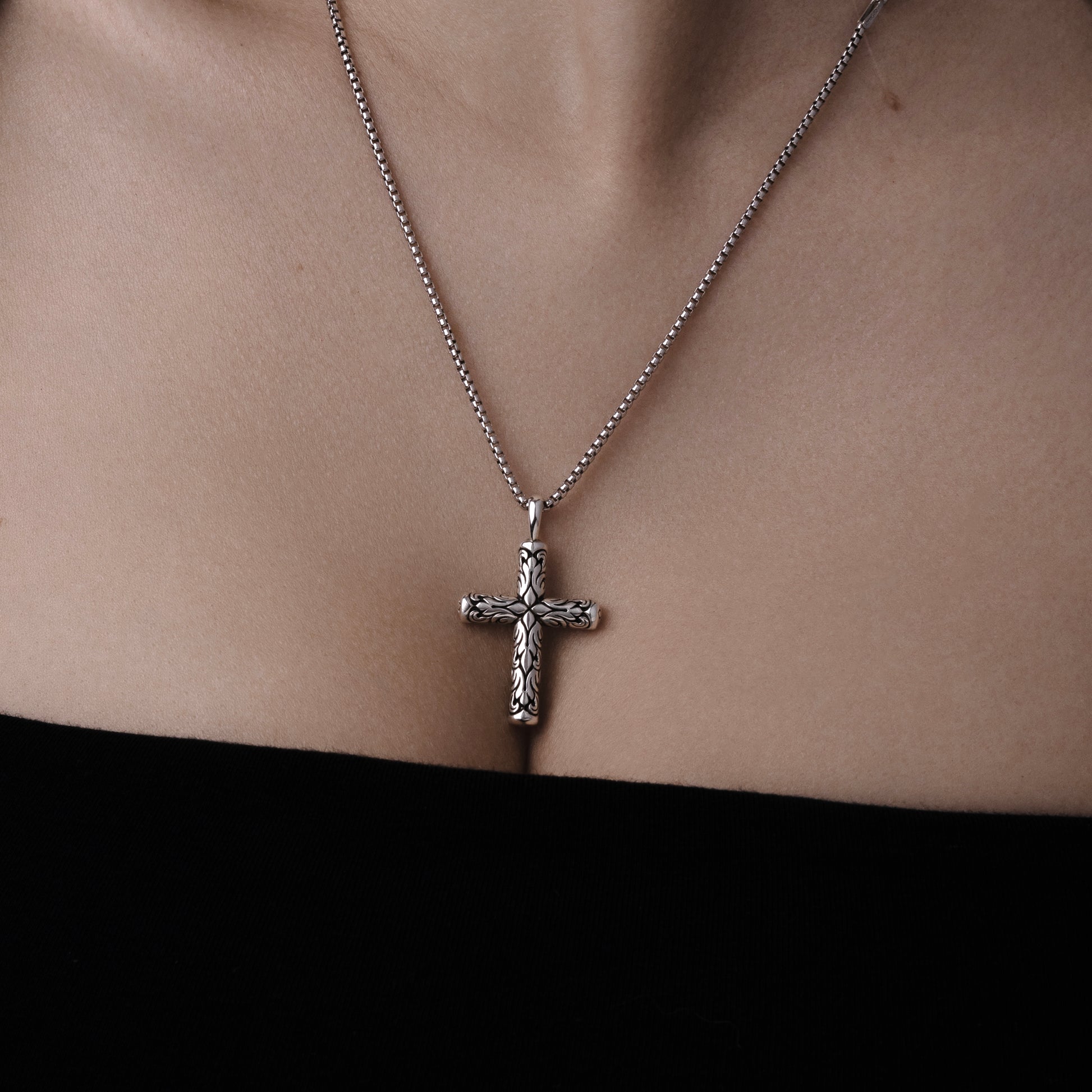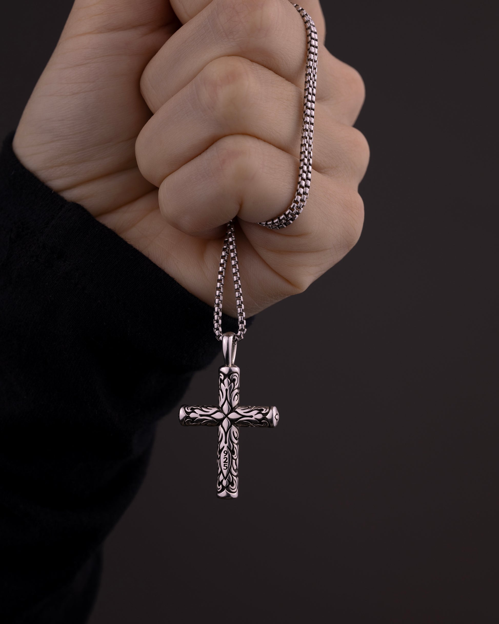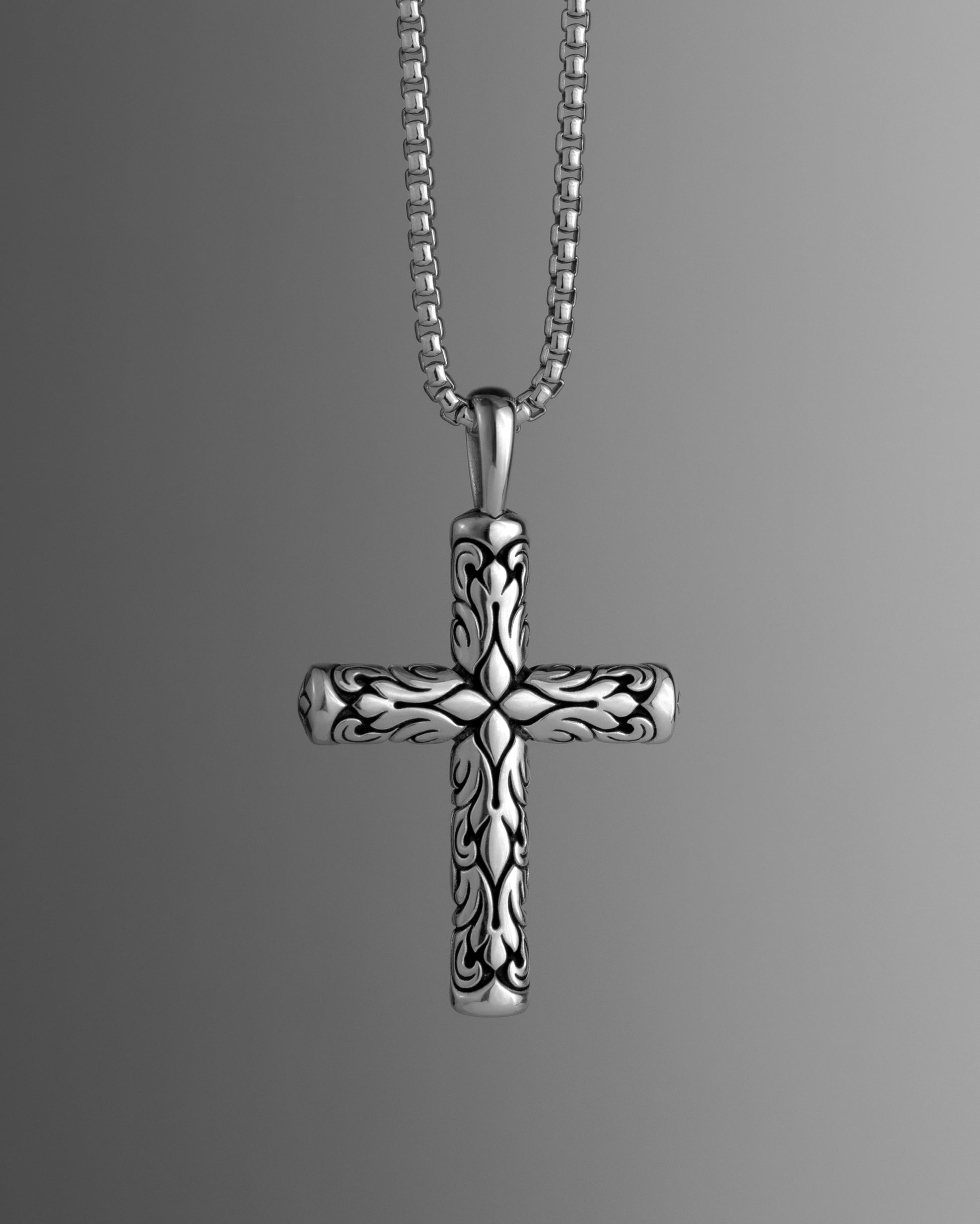 A bold sterling silver cross pendant defined by satisfying three-dimensional thickness and intricate engraved scrollwork with subtle fire-like movement. This sculptural relic is fully carved on all sides, revealing a seamless, elegant silhouette with a substantial weight and timeless symbolism.