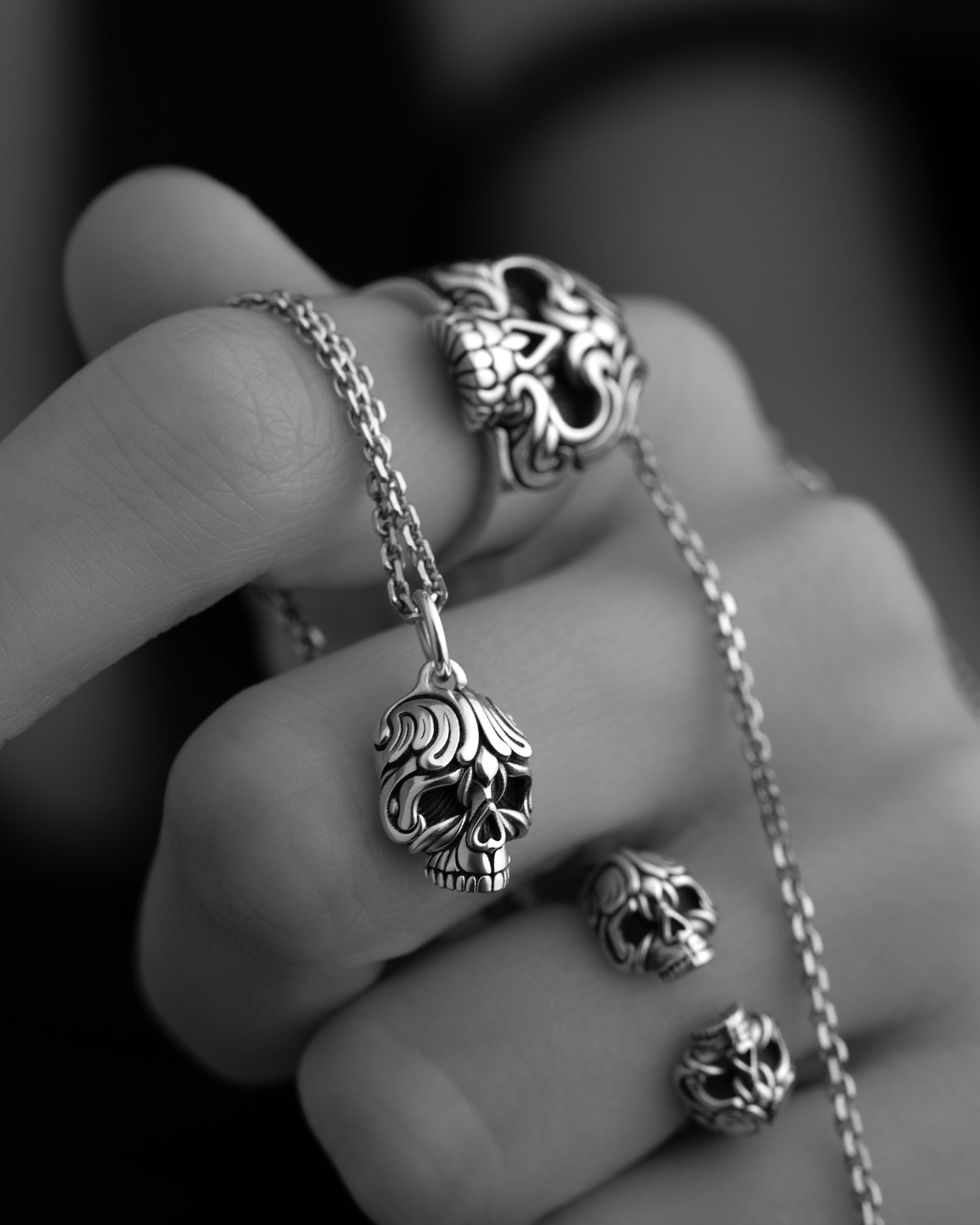 Delicately sculpted skull charm featuring intricate lace-like scrollwork - where gothic artistry meets quiet elegance. A sophisticated memento mori symbol, perfect for those who embrace mortality and transformation with timeless style.